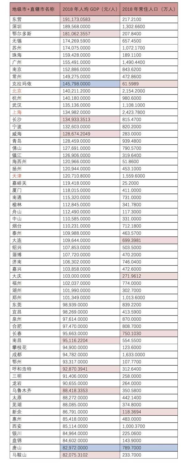 1、部分城市2018年人均GDP数据缺失,采用GDP现价与人口推算(标红),若仍缺失无法计算,则采用2017年数据替代(标蓝)2、部分城市人口数据缺失,采用GDP与人均GDP推算(标蓝)