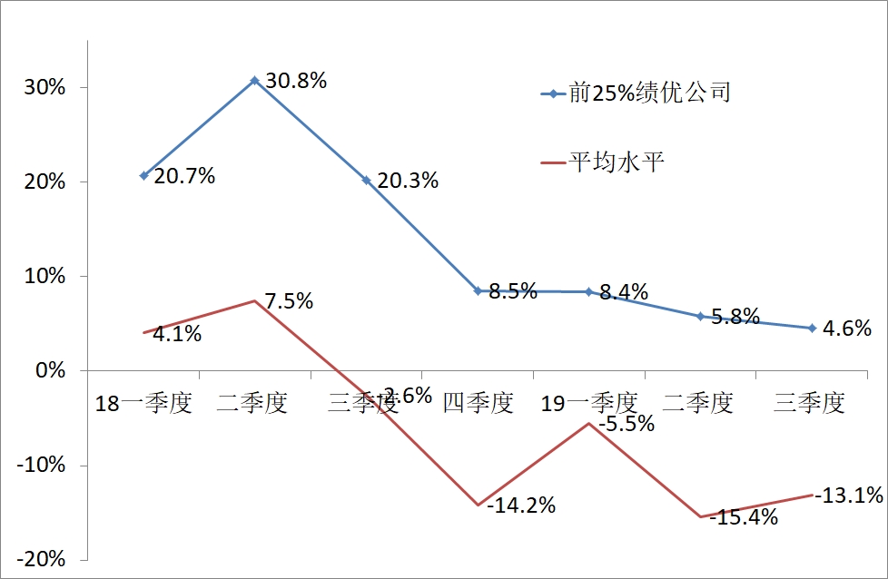 从A股上市公司公布的今年三季度报告看,分化非常严重,超过30%的行业整体利润出现负增长。剔除2017年以来新上市公司,3000多家公司扣除非经常性损益后,利润增幅已连续五个季度出现负增长,而且幅度惊人。即便绩优公司(ROE水平在前25%)仍有增长,但增福明显收窄,且低于GDP增速。