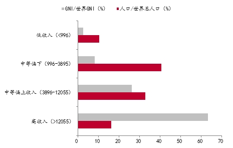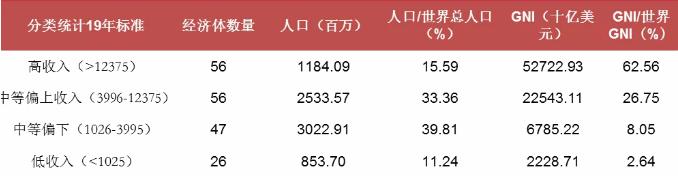 事实上,最近两年依据世界银行的分类,高收入经济体的人口占全球人口比重一般在16%左右,而低收入经济体的人口占比在10%左右,两者相加为26%,但中等偏下的占比接近40%,中等偏上的占比超过30%。也就是说,中等偏上加上高收入人口占比在50%左右,中等偏下加上低收入人口的占比也在50%左右。 全球各大经济体收入分组概况