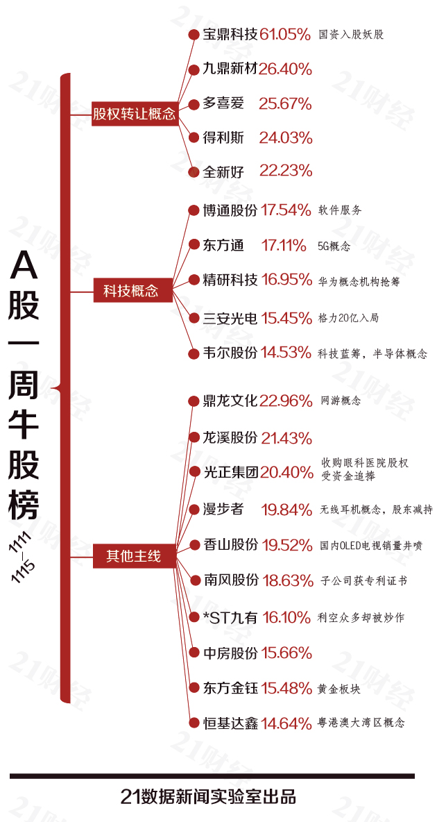 本周最大的投资主线无疑是股权转让概念。剔除最近一个月上市的新股,21数据新闻实验室整理发现,整个A股周涨幅最大的6只股票就有5只来自该板块。