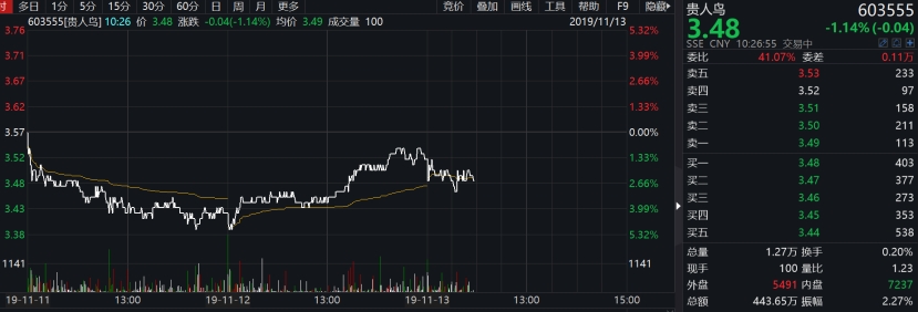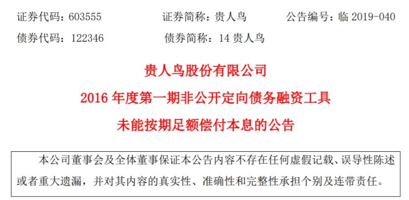 贵人鸟在上市之初还有着“A股体育第一股”的光环,市值曾高达400亿元。但截至11月13日上午10点半,贵人鸟股价暂报3.48元,与四年前高点69元相比跌去近95%,市值也从曾经400多亿元跌到只剩下约21.5亿元。 面对这样的经营压力,除了股民忧心以外,债权人也“提心吊胆”。 近日,贵人鸟一纸公告宣布,金额为5亿元的“16贵人鸟PPN001” 不能按期足额支付本息,已构成实质性违约。值得一提的是,这是贵人鸟史上首次出现债券违约。