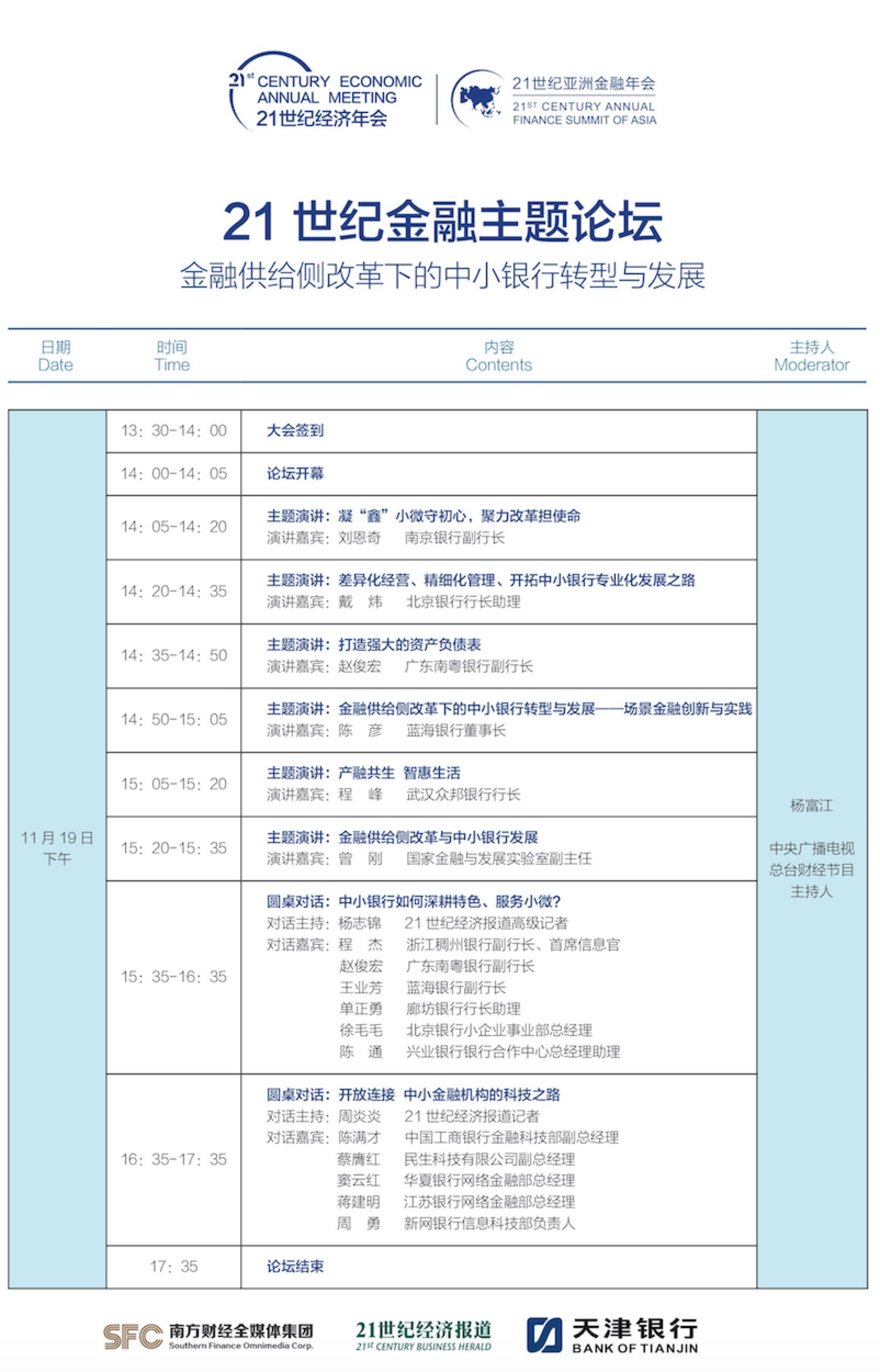 第十四届21世纪亚洲金融年会11月19日下午的三个金融主题论坛分别为:金融供给侧改革下的中小银行转型与发展、财富管理的质变时代、科技·普惠。议题围绕着今年热点与对明年形势的展望,邀请业内大咖进行主题演讲与细化的圆桌会议,360度全方位畅所欲言。