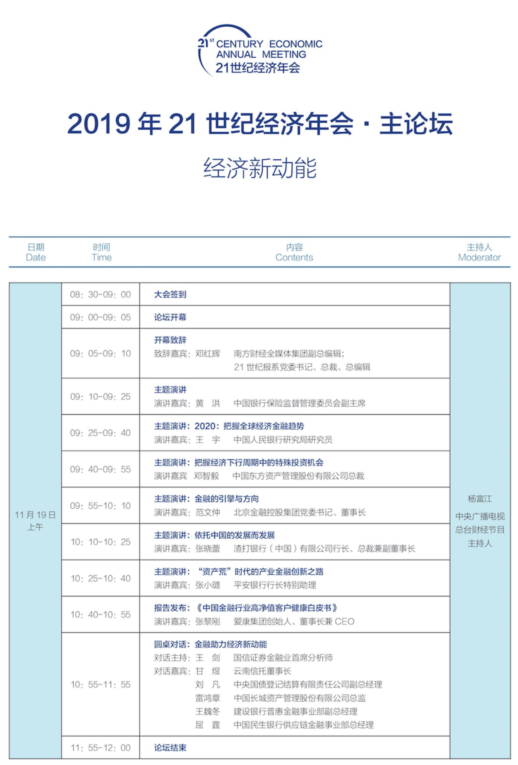 2019年『21世纪经济年会』主论坛便是围绕这个主题,广邀监管层、金融机构、企业领军人物,论道培育增强“经济新动能”。以下,是最新公布的议程:
