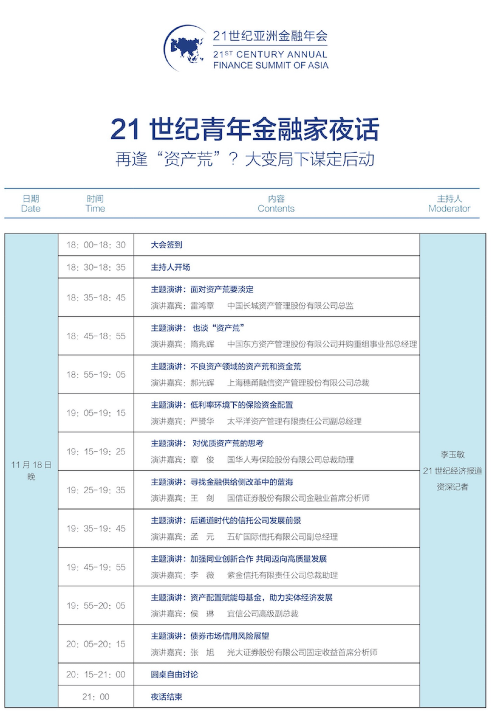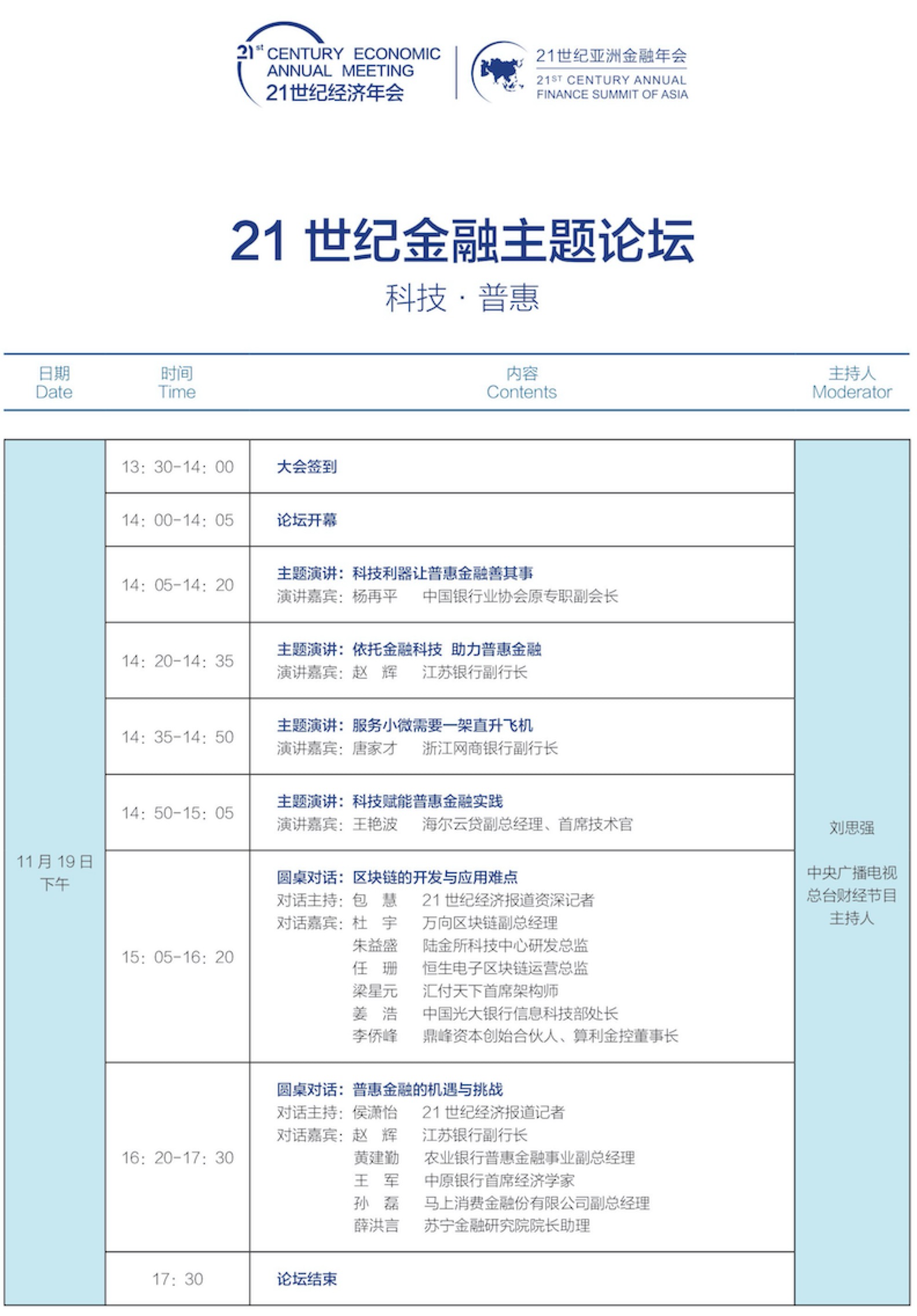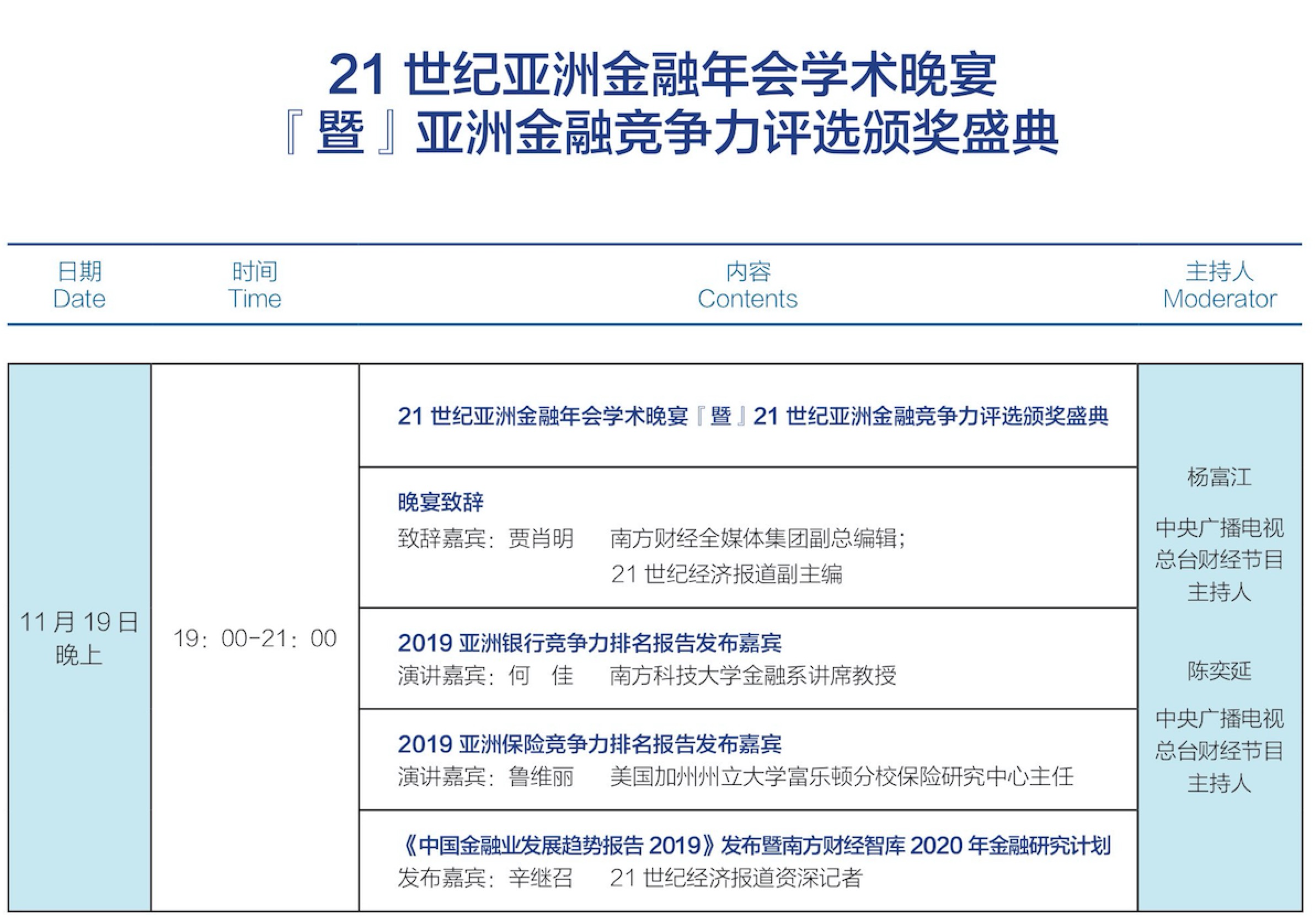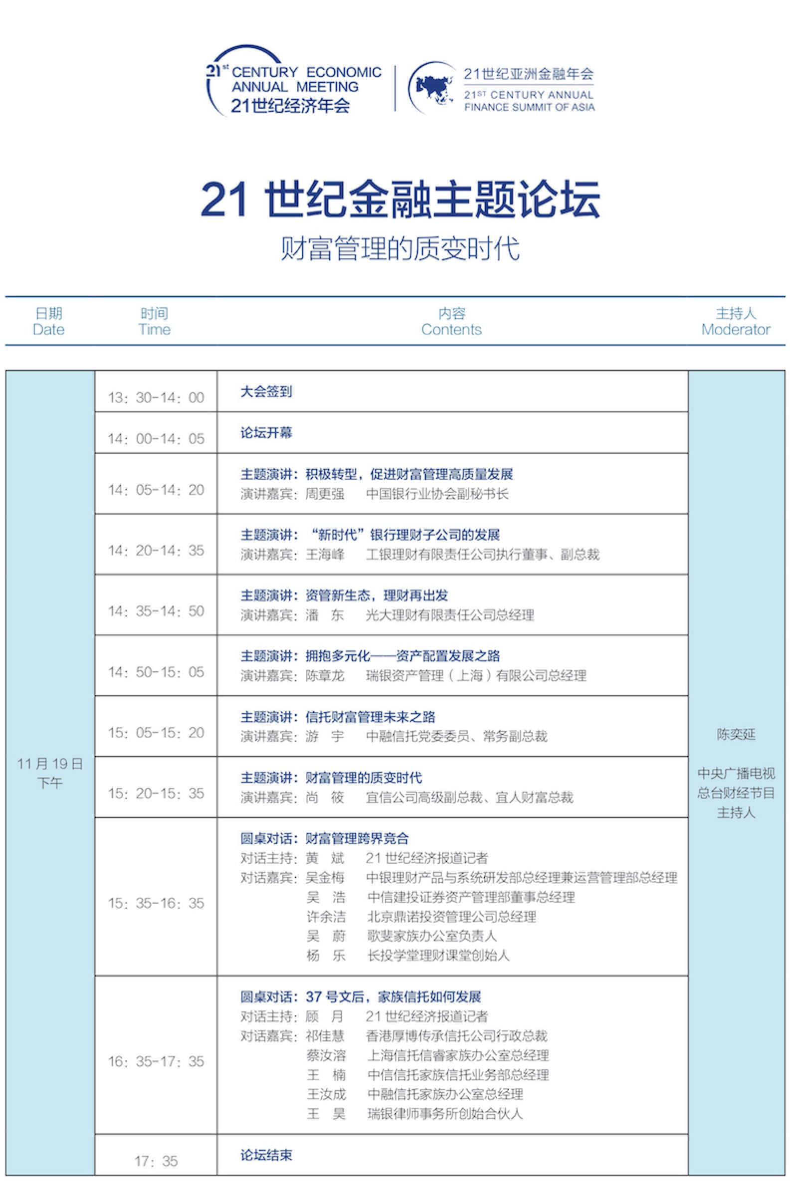 11月19日,除了上午的『21世纪经济年会』主论坛,下午还将有第十四届21世纪亚洲金融年会三场金融主题论坛重磅登场:
