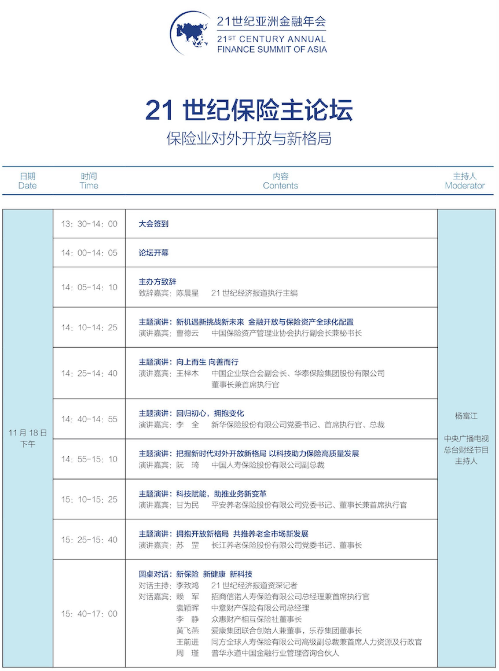 『第十四届21世纪亚洲金融年会』保险主论坛以及21世纪青年金融家夜话,于昨天(11月18日)圆满闭幕,以下是昨日活动议程和嘉宾: