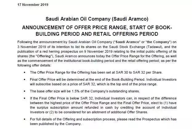 沙特阿美计划通过出售1.5%的股份筹集240亿美元至256亿美元,而这可能是全球最大的首次公开募股(此前阿里巴巴曾筹集250亿美元)。面向个人投资者的认购日期为11月17日至11月28日;面向机构投资者的认购日期为11月17日至12月4日。