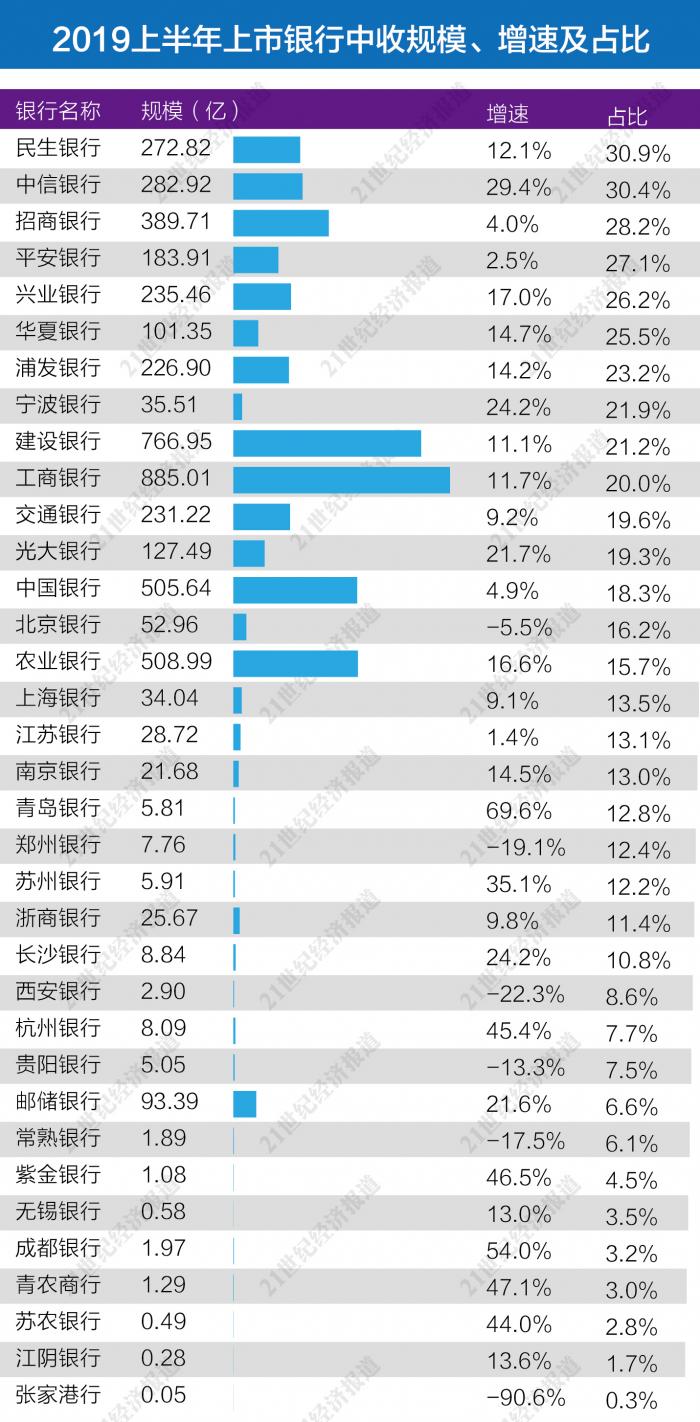 数据显示,截至2019年6月末,工商银行的中收规模达到885.01亿,位居榜首。中收规模呈现出国有大行高于股份行、股份行高于城商行、城商行高于农商行的趋势。从中间业务收入/营业收入这一核心指标看,股份行表现突出,其中民生银行最高为30.9%。