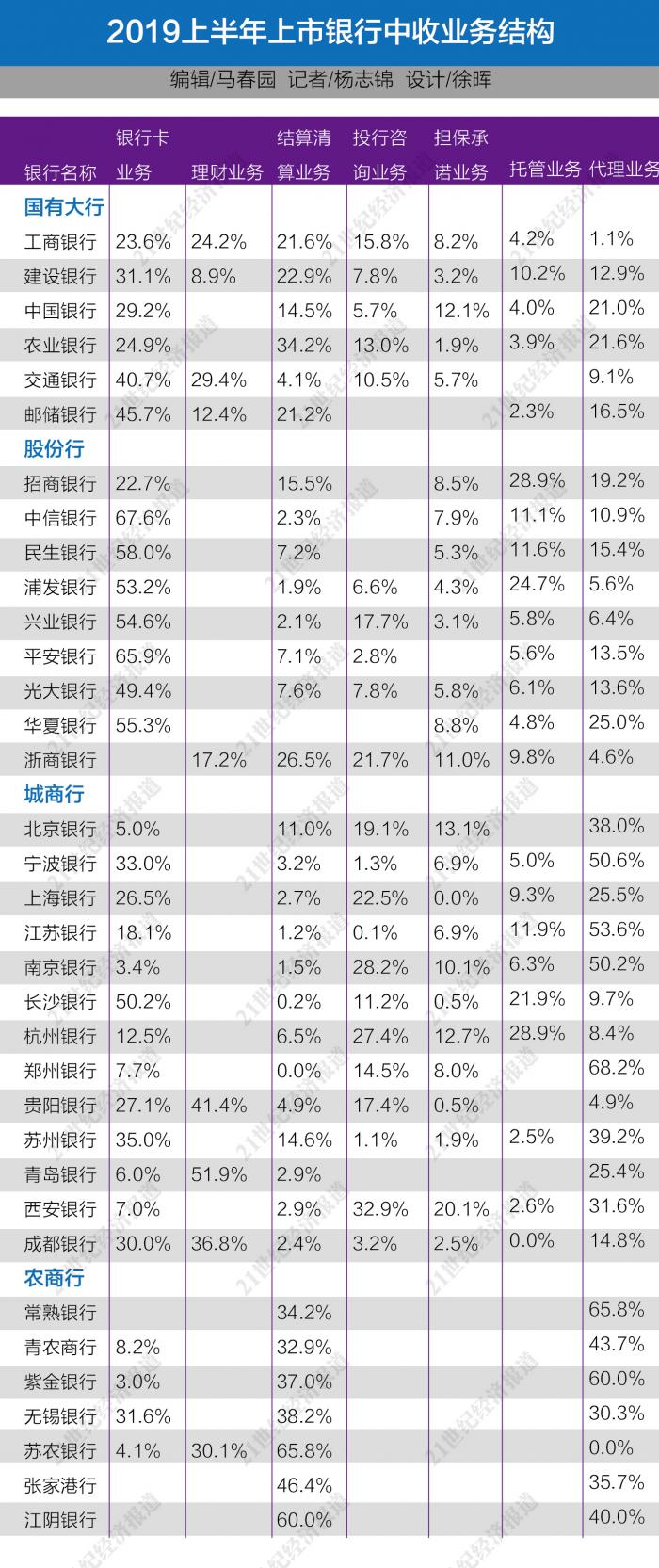 上市银行对于中间业务的统计口径不一,名称差异较大,甚至计入类别的方式也不一样。比如有的银行单独设有理财业务收入一栏,有的则将理财业务收入计入托管业务或者代理业务手续费。不过这缺少明细数据进一步调整,因此横向比较只能相对反映各银行的中收结构情况。