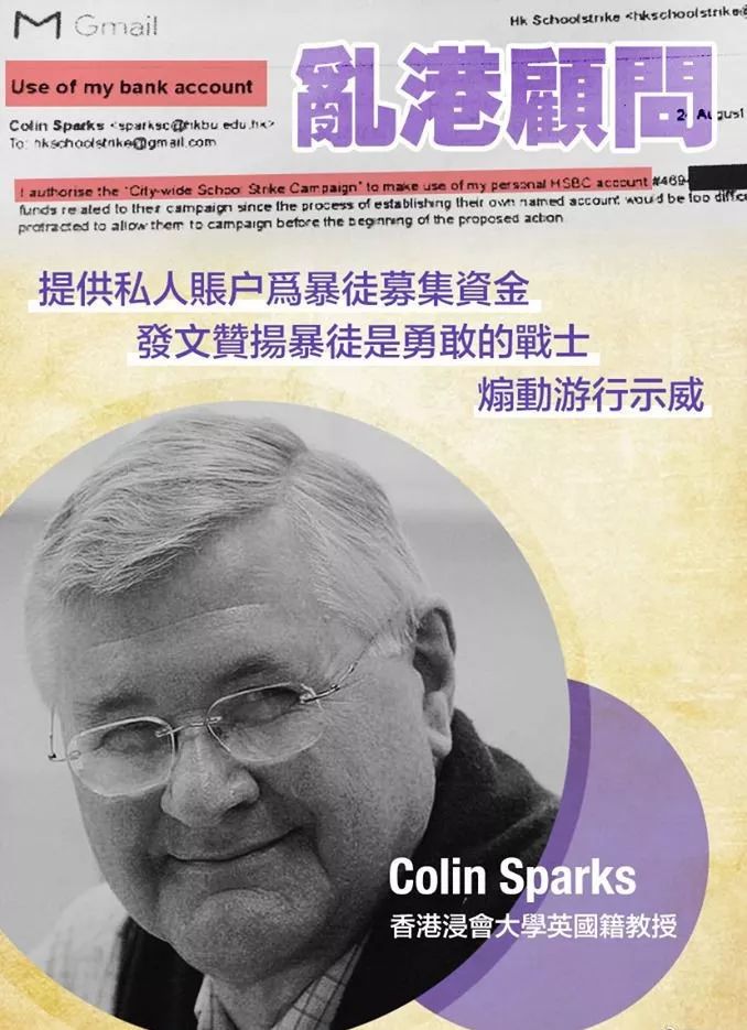 柯林·斯巴克斯,这位香港浸会大学的英国籍文化传播的学者,主动提供私人账户,为暴徒保管示威活动募集的大量资金;发表赞扬暴徒的文章,诋毁香港警察;在网络平台上煽动激进示威。