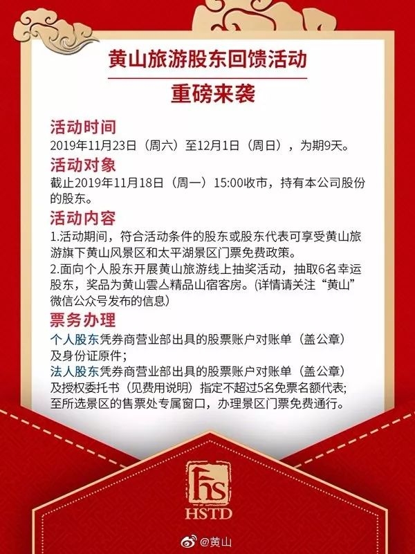 11月14日,黄山旅游公司发起了股东回馈活动,通知显示,活动时间为2019年11月23日至12月1日,为期9天。截至2019年11月18日15时收市,持有黄山旅游股份的股东可享受黄山旅游旗下黄山风景区(门票价格190元)和太平湖景区门票(门票价格45元)免费政策。
