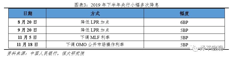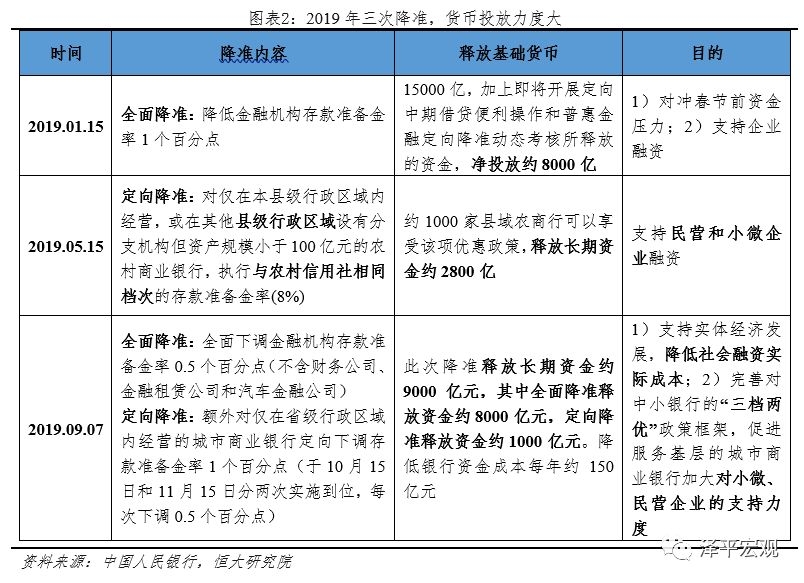 2019年货币投放相对宽松,央行三次降准、小幅多次降息,货币环境整体稳健。1)2019年1月全面降准1个百分点,加上回笼MLF操作,净投放资金约8000亿元;2)5月定向降准,释放长期资金2800亿元;3)9月降准为2018年以来的最大力度投放,全面降准0.5个百分点、定向降准1个百分点,合计投放资金9000亿元,其中全面降准释放资金约8000亿元,定向降准释放资金约1000亿元,且没有置换MLF、实施动作较快;4)连续小幅多次降息,8月20日、9月20日LPR利率分别下调6BP和5BP,11月5日MLF利率下调5BP,11月18日公开市场操作利率下调5BP。