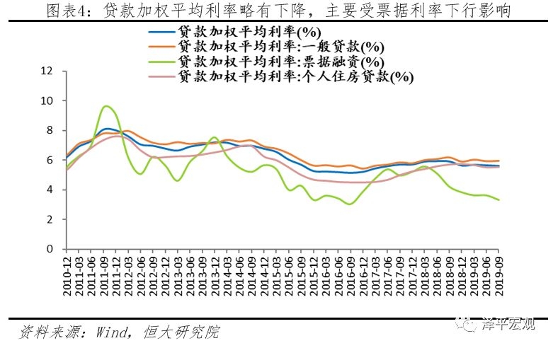 3)央行改革完善LPR形成机制引导企业贷款利率下行,但实际效果相对有限。9月贷款加权利率略有下滑,但主要受票据利率下行影响,其中一般贷款加权平均利率为5.96%,较6月上升0.02个百分点,表明实体企业融资成本并未得到明显改善,尤其民营和中小企业。我们认为,当前货币政策不仅是“宽货币”的问题,更关键是“宽信用”的问题。2019年基础货币投放整体宽松,但信用创造不足,金融环境整体稳健、但局部信用紧张。一方面,货币投放整体宽松,2019年2次全面降准、1次定向降准、并多次下调LPR、MLF和OMO利率;另一方面,民企和小微企业融资难融资贵问题突出,房地产融资过度收紧,信用创造不足与企业信心不足、改革开放有待深化、信用分层等结构性问题有关。