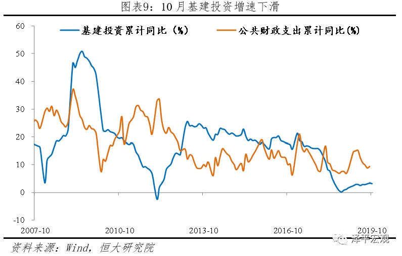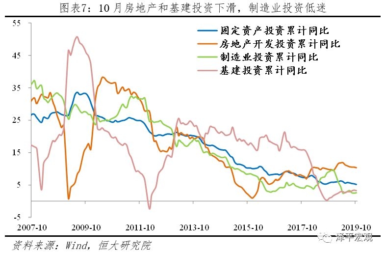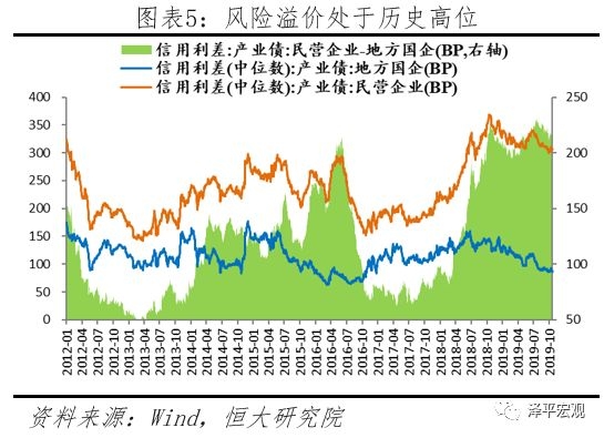 流动性分层依然严峻,信用溢价处于历史高位,民营小微融资难贵仍突出,房地产融资过度收紧。2019年基础货币投放并不少,但信用创造层面出了问题,这跟企业信心不足、改革开放有待深化有关。10月末地方政府专项债券余额同比增长29.5%,委托贷款、信托贷款却同比下降8.2%和4.1%,表明地方政府以及国企融资环境改善,而民营、中小企业融资可得性仍然较差。