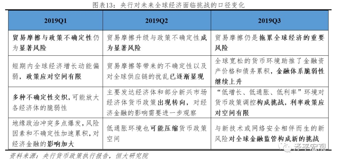 展望未来,贸易摩擦仍是拖累全球经济的重要风险,全球金融脆弱性继续累积,“低增长、低通胀、低利率”环境、网络技术安全等因素均对货币政策构成新的挑战。其一,全球贸易摩擦虽有所缓和但不确定性犹存,未来若再度升级将进一步破坏全球供应链,并在中期内影响全球生产率和产出增长。其二,全球宽松的货币环境助推了金融资产价格和债务累积,金融体系脆弱性继续上升,风险因素可能导致避险情绪骤升冲击金融体系稳定。其三,利率政策的空间较为有限,继续实施量化宽松等非常规货币政策的边际效果可能也较为有限,难以应对“低增长、低通胀”的经济环境。