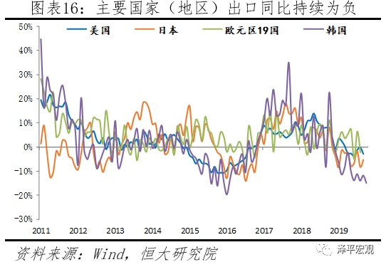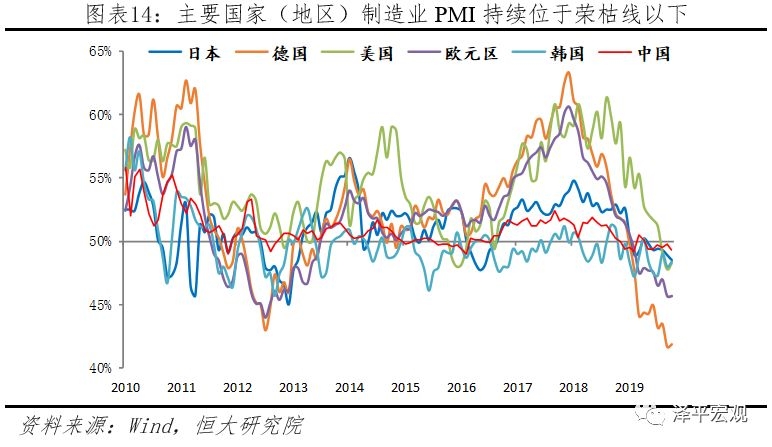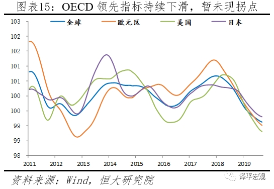 全球经济增速放缓,增长动能不足,贸易摩擦与地缘政治等不确定性形成拖累。1)从全球整体来看,贸易增速放缓、制造业持续低迷。2019 年第二季度贸易增速出现金融危机以来的首次季度负增长,增速为0.14%。“贸易风向标”韩国10月出口同比-14.7%。10月全球制造业PMI为49.8%,已连续6个月处于枯荣线下,全球OECD综合领先指数持续下行;2)发达经济体增速同步放缓,呈现“低增长、低通胀、低利率”态势。美国经济增速放缓,投资、出口需求走弱,消费短期仍有韧性但薪资增速持续下行,库存、产能周期向下,企业杠杆率创历史新高,领先指标PMI和OECD综合指数下行,经济放缓态势确立,三季度GDP同比2%,创2017年1季度以来新低;欧盟经济增长基本陷入停滞,主因全球贸易摩擦升级,龙头德国经济失速,二季度经济增速零增长,工业生产指数连续14个月负增长,英国脱欧负面影响显现。日本、韩国受外需疲软影响,出口暴跌、制造业持续疲软。3)新兴经济体发展分化,但亦呈疲软趋势。印度、墨西哥2019年以来经济增速均出现不同程度的下滑。阿根廷因其国内政治局势再度引发金融市场动荡,阿根廷比索一度跌37%。