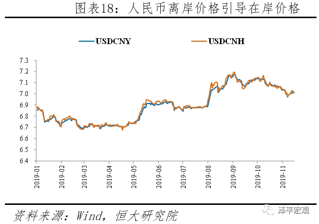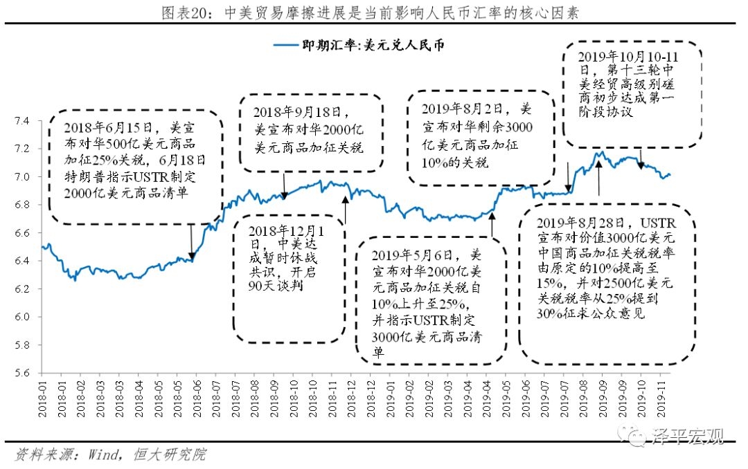 2019年,中美贸易摩擦是影响人民币汇率的核心因素。1)前三季度,人民币汇率前升后贬,与贸易摩擦进展一致。2018年末至2019年4月末,中美开启90天谈判后,市场信心提振,人民币对美元汇率自6.85小幅回升至6.74。2019年5月6日,美方宣布对华2000亿美元商品加征关税自10%上升至25%,并指示USTR制定3000亿美元商品清单,贸易摩擦升级,汇率快速走贬。2019年8月2日,特朗普宣称将于9月1日起对华剩余3000亿美元商品加征10%关税,直接刺激人民币离岸和在岸汇率双双“破7”。2)10月至今,人民币有所回升,贬值压力缓释,主要受贸易摩擦缓和、美元指数承压影响。其一,中美贸易摩擦缓和,2019年10月10-11日,中美重启贸易谈判,第十三轮中美经贸高级别磋商初步达成第一阶段协议。10月25日,国务院副总理刘鹤与美方贸易代表确认部分文本的技术性磋商基本完成。其二,美联储开展降息扩表的政策组合,叠加近期英国脱欧新进展,美元指数短期内下行压力加大。