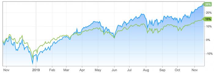 在美国三大股指屡创新高的同时,科技股作为过去10年推动美股大盘增长的“顶梁柱”再次引起市场的关注。尽管2019年各国政府加强了对科技股的监管,但是今年科技股的表现仍是十年来最出色的一年。截至目前,2019年标普500指数科技板块的涨幅为41%,远高于标普500指数的24%,创下2009年以来最大增幅。
