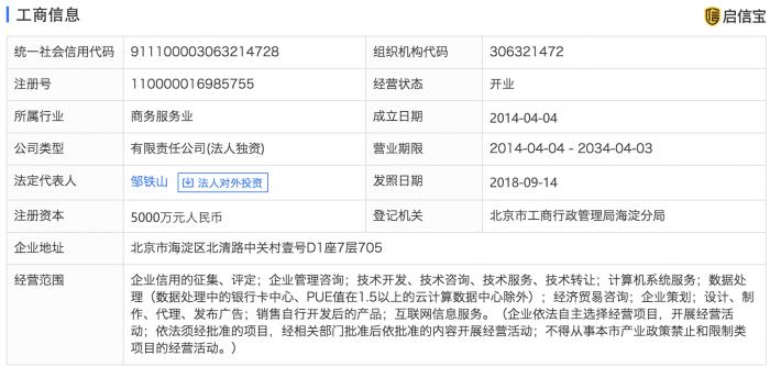 公开资料显示,北京考拉征信服务有限公司是一家第三方的信用评估及征信管理服务商,法定代表人为邹铁山。据其官网介绍,公司成立于2014年4月,是人民银行批准的八家个人征信批筹企业之一,是百行征信九家发起股东及董事单位之一。其业务包括:企业信用的征集、评定;企业管理咨询;技术开发、技术咨询、技术服务、技术转让;计算机系统服务;数据处理等。
