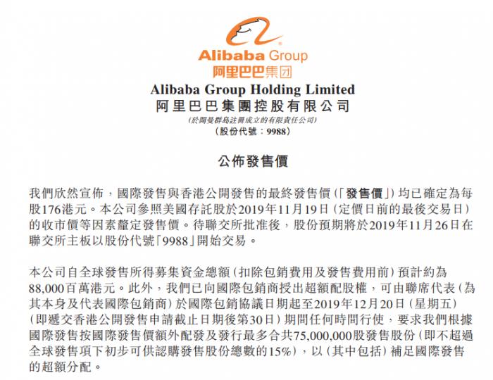阿里巴巴:将香港IPO的发行价定为176港元/股,预计筹集880亿港元