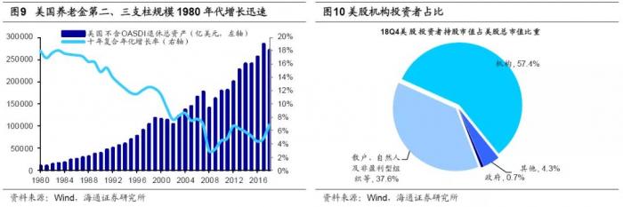 ② 机构投资者占比不断提升带来长牛。美国1980年代以来,伴随着股权融资大发展,机构投资者持股占比也从32%升至57%。由于DC(401K)与IRAs计划的推出,美国养老金规模快速上升,1980年代美国养老金第二三支柱规模十年复合年化增长率高达18%。随着养老金规模上升,养老金入市规模也同时放大。以IRAs计划为例,计划成立至1980年IRAs资产配置银行储蓄的比例一直在70%以上,之后储蓄的配置力度开始下降,共同基金的配置比例从1980年的3%上升到2000年的48%,证券及其他资产的比例从5%上升到35%。而根据ICI的统计,IRAs投资的共同基金中,股票型基金的比例也从1990年的42%上升到2000年的73%,即养老金有一大部分都流入了股市。对应股票方面,二级市场指数增长迅猛,道琼斯工业指数从2634点一度飙升到2018年的26951点,增长近10倍;标普500指数从330上升到2018年的2940点,上涨近9倍;纳斯达克指数作为后起之秀,在这一阶段也得到了大幅提升,1990年指数仅374点,而在2018已经达到了8133点的高位,翻了近21倍。股指的增幅反映了上市股票走势的上扬和市场的高度繁荣。