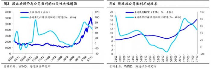 ② 改善公司股价和盈利,提升两者相关性。股权分置改革使得“利益分置”问题不复存在,共同的利益基础得以重建,“同股同权同利”这一资本市场基本属性得以恢复,大股东攫取中小股东的利益和掏空上市公司的动机得到缓解,大股东更加关心公司股价,关注公司盈利和竞争力,不断注入优质资产、优化公司治理,谋求公司长效发展,从而助推上市公司盈利的改善。股改前平均全部A股归母净利润同比增速为22.3%(由于全部A股归母净利润同比增速数据仅有01年1季度之后的,我们选取01/04-05/06进行对比),股改后一轮牛市(05/07-07/12)平均全部A股归母净利润同比增速为32.3%,为牛市的持续奠定良好的基本面基石。股改后的一轮牛市(05/06-07/10)全部A股平均ROE(TTM)为10.51%,而股改前的全部A股平均ROE(TTM)为8.01%(由于全部A股ROE数据仅有03/01之后的,我们选取03/01-05/05进行对比)。从股价和盈利的相关性来看,股改后的一轮牛市全部A股ROE中枢与全部A股加权收盘价的相关系数高达95.9%,而股改前的相关系数仅为-71.3%,股价与公司盈利的相关性大幅增强,说明股改后的股价更为准确地反映了公司的经营状态,股价得到公司基本面的支撑。