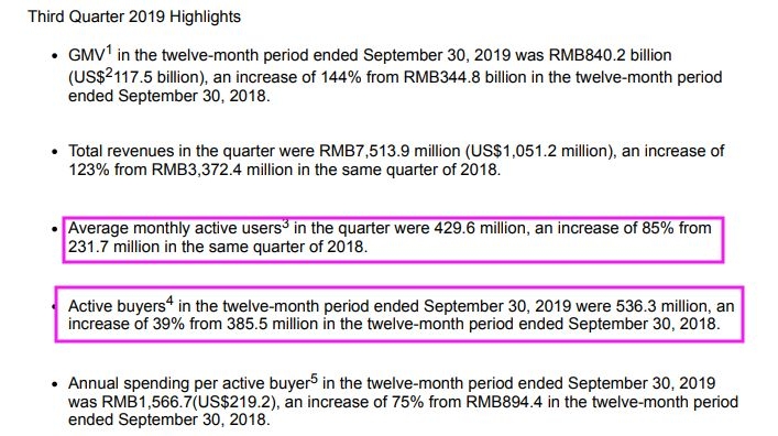 三季报显示,截至2019年9月30日,拼多多年活跃买家数达5.363亿,较去年同期增长39%。