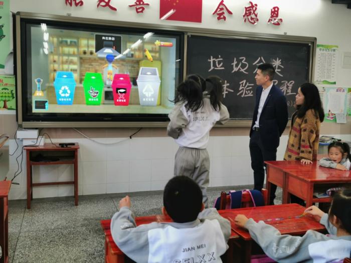 在贵阳市精灵果幼儿园和贵阳市云岩区省府路小学的课堂上,小朋友能够以第一人称的方式进入“恩授”AR体感互动教学系统,通过简单的肢体动作,将各种各样的垃圾放进“可回收物”、“其他垃圾”、“厨余垃圾”、“有害垃圾”等对应的垃圾桶里面。