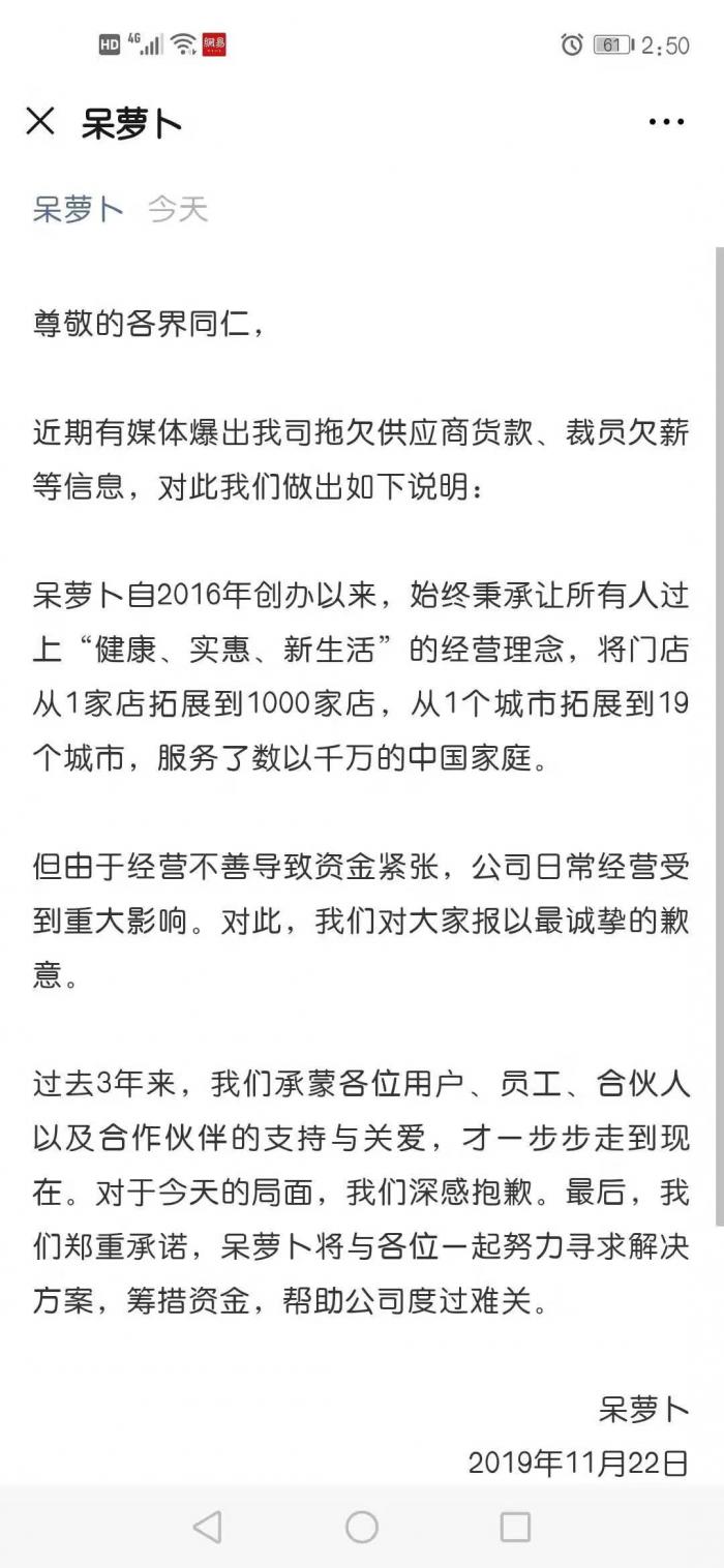 声明称,“由于经营不善导致资金紧张,公司日常经营受到重大影响。对此,我们对大家报以最诚挚的歉意。过去3年来,我们承蒙各位用户、员工、合伙人以及合作伙伴的支持与关爱,才一步步走到现在。对于今天的局面,我们深感抱歉。最后,我们郑重承诺,呆萝卜将与各位一起努力寻求解决方案,筹措资金,帮助公司度过难关。”