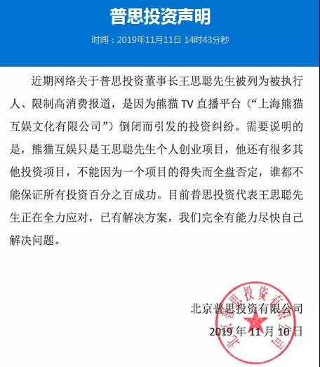 对此,普思投资在其官网发布声明称,近期网络关于王思聪被列为被执行人、限制高消费报道,是因为熊猫TV直播平台倒闭而引发的投资纠纷。目前普思投资代表王思聪正在全力应对,已有解决方案。
