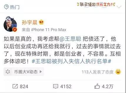 另外,还有币圈人士借此大蹭热点。例如,在王思聪传出被执行人消息的第一时间,90后币圈大佬、波场TRON创始人孙宇晨即在微博称“如果是真的,考虑帮王思聪把债还了”,并大方表示“过去的事情就过去了,现在是特殊时期,都是创业者不容易”。并在微博里持续与网友互动,“被执行了就是还不上啊”、“1.5个亿就算天使轮投资了”。