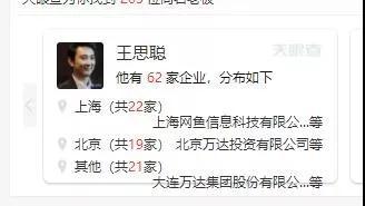 作为万达集团董事长王健林之子。数据显示,王思聪名下有62家公司,对108家公司拥有实际控制权。