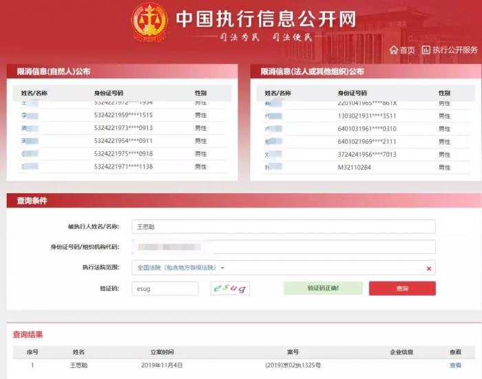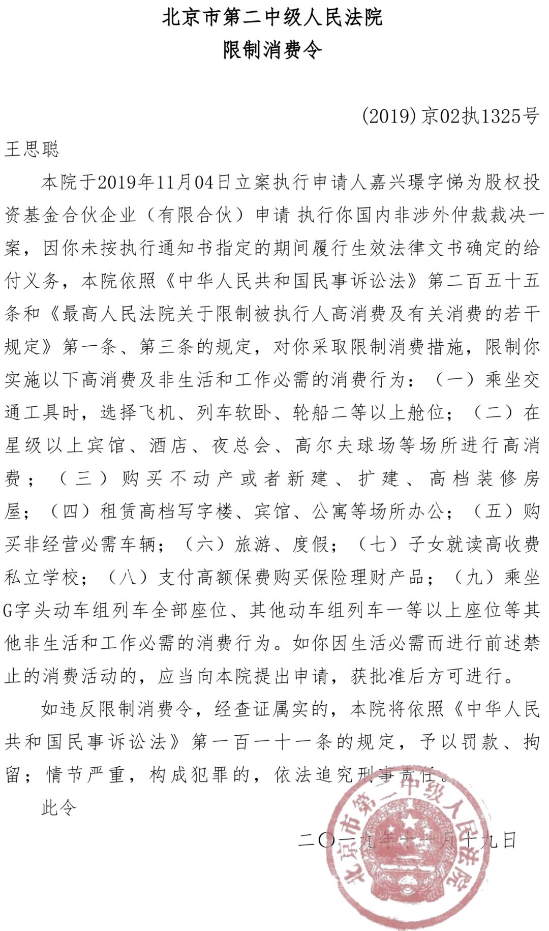 王思聪于11月4日被北京市第二中级人民法院列为被执行人,执行标的1.5亿余元。之后,中国执行信息公开网查询显示,法院已在11月19日向王思聪下达了限制消费令。
