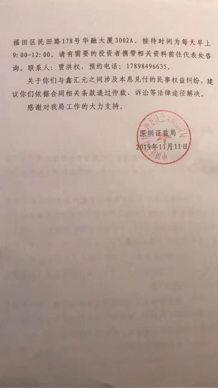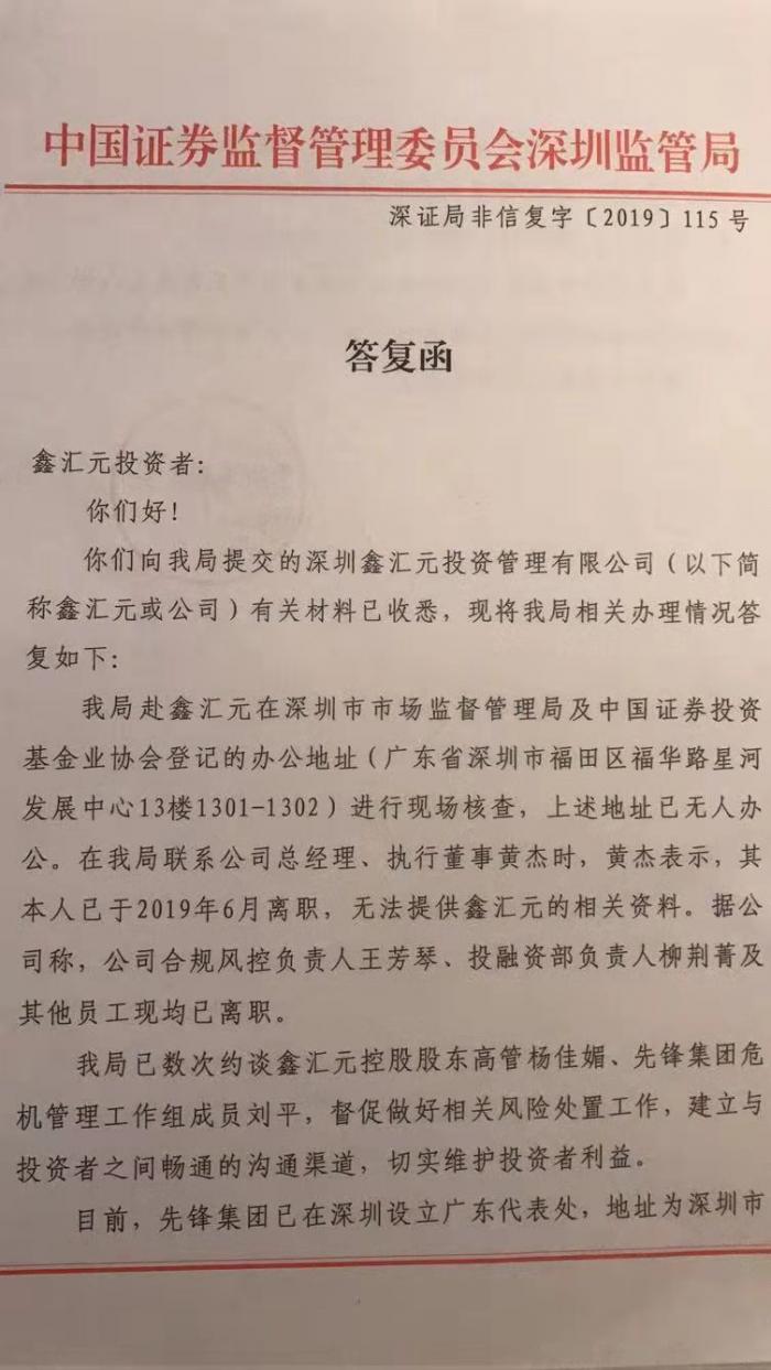 深圳证监局表示,该局已数次约谈鑫汇元控股股东高管杨佳媚、先锋集团危机管理工作组成员刘平,督促做好相关风险处置工作,建立与投资者之间畅通的沟通渠道,切实维护投资者利益。