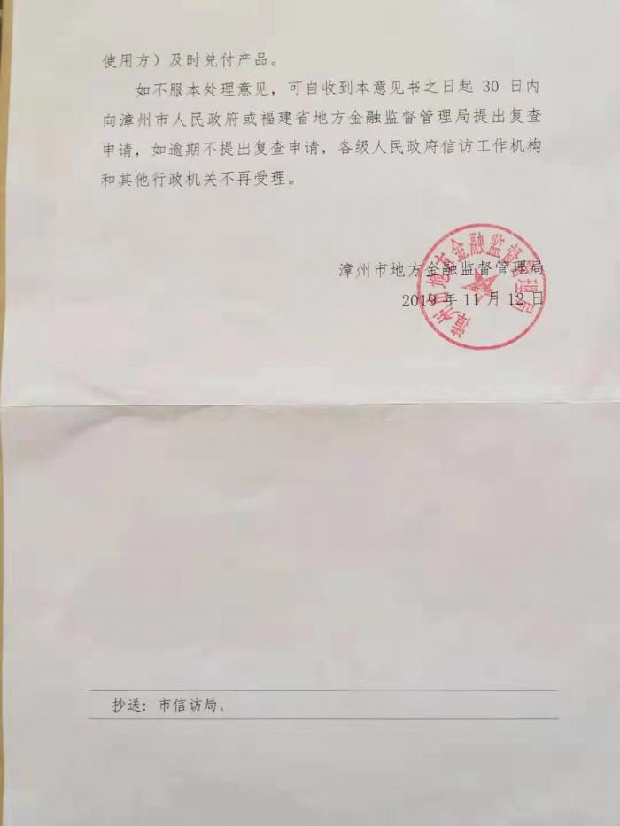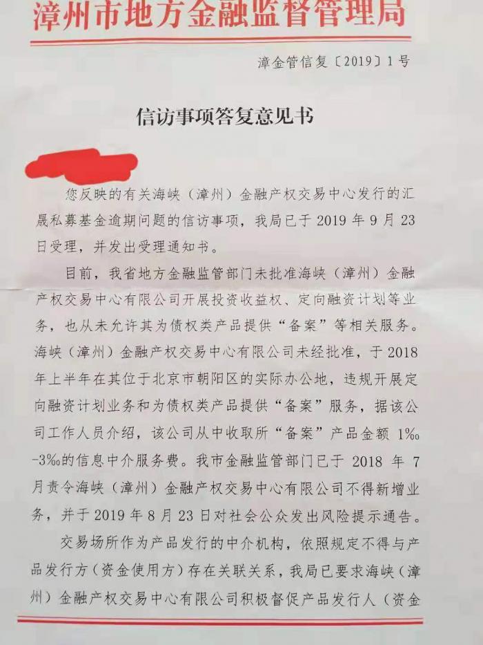 与此同时,先锋系合作交易所方面也有新动态。漳州市金融局向投资者发了信访事项答复意见书称,交易场所作为产品发行的中介机构,依照规定不得与产品发行方(资金使用方)存在关联关系,该局已要求海峡(漳州)金融产权交易中心积极督促产品发行人(资金使用方)及时兑付产品。