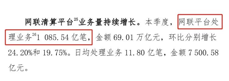 1085.54 亿笔!今年第三季度,网联平台处理业务突破千亿笔大关,季度首次超过1000亿笔大关,日均处理业务11.80亿笔;3个月1085亿笔,也就是1000亿笔只需2个多月。
