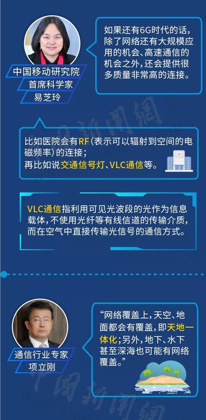 中国工程院院士余少华称,未来6G网络的趋势和愿景,5G可能会做到人、网、物,后面要把境加上来。加境后,我归纳了四句话,无人不互联、无处不互联、无时不互联、无事不互联。”