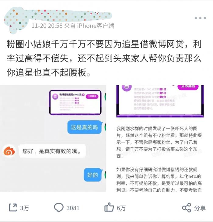 “粉圈小姑娘千万千万不要因为追星借微博网贷,利率过高得不偿失。”11月20日,一位微博用户发微博称,另附一张截图显示:借款金额不低于1000元,点赞数翻2倍;借款金额不低于5000元,点赞数翻5倍;借款金额不低于8000元,点赞数翻8倍。