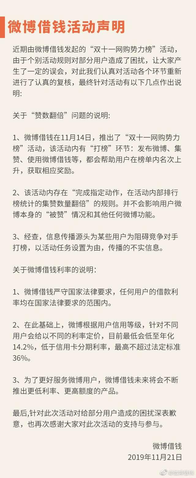 对此,11月21日,微博借钱官方微博声明称,微博借钱在11月14日,推出了“双十一网购势力榜”活动,该活动内有“打榜”环节:发布微博、集赞、使用微博借钱等,都会帮助用户在榜单内名次上升,获取相应奖励;该活动内存在“完成指定动作,在活动内部排行榜统计的集赞数量翻倍”的规则,但并不会影响用户微博本身的“被赞”情况和其他任何微博功能。