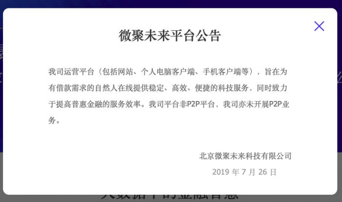 “微博借钱”运营主体是北京微聚未来科技有限公司,官网显示,北京微聚未来科技有限公司成立于2015年8月,总部位于北京,目前已经搭建起了一整套线上流量至金融机构的落地方案和线上系统,并稳定运营近两年,目前微聚未来服务多家大型互联网平台,数十家金融机构,与近百家金融科技公司建立了长期稳定的合作关系。