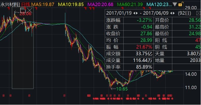 2017年1月19日至2017年6月9日,永兴材料股价横盘震荡,期间股价下跌3.27%。