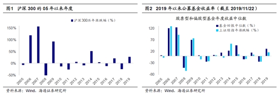 截至19/11/22,今年以来上证综指涨虽然只有15.7%,而创业板指累计涨幅达34%、沪深300涨28%。截至19/11/22,今年主动股票型基金(剔除被动指数基金)以及偏股混合型基金累计净值回报中位数也已经达到31%。对比历史,今年沪深300指数(3849.995, -39.60, -1.02%)(3849.9948, -39.60, -1.02%)涨幅仅次于06-07年、09年、14年等牛市阶段,公募基金净值回报中位数也仅次于06-07年、09年、2015年。但从估值角度来看,目前A股估值水平并不高,因此大部分投资者也认为明年股市将继续小幅上涨。