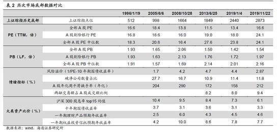 从PB看,目前为1.54倍、处于2005年以来自下而上9.5%分位。剔除银行的A股口径,目前为1.97倍,处于2005年以来从低到高25.3%分位。全部A股中位数口径,目前为2.16倍,处于2005年以来从低到高20.1%分位,详见报告《年底算算估值账-20191120》。