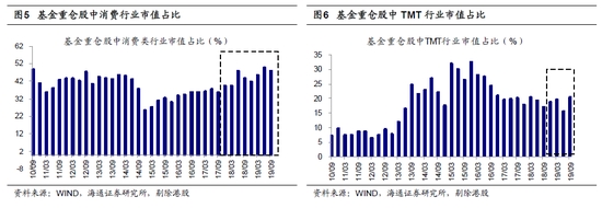 正因此,公募代表的机构投资者配置上已经偏向消费和科技类行业,从公募基金仓位结构来看,19Q3基金重仓股(剔除港股)中大消费类行业(包括汽车、家电、食品饮料、纺织服装、商贸零售、餐饮旅游、农林牧渔、医药、轻工制造)市值占比为47.5%,处于历史高位。