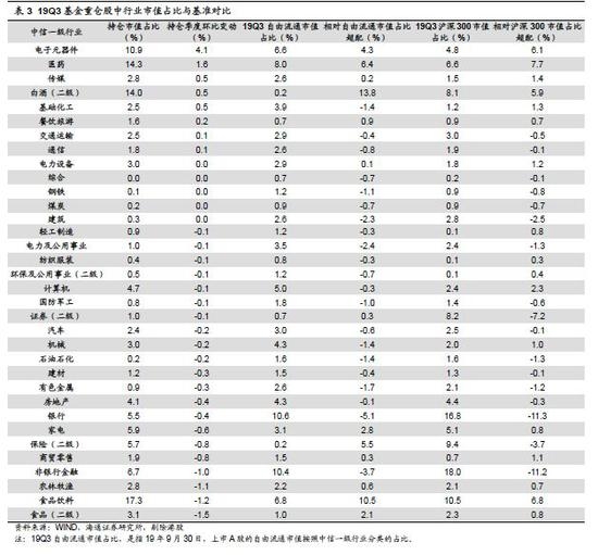 对比沪深300中行业占比,白酒大幅超配5.9个百分点,医药大幅超配7.7个百分点。19Q3基金重仓股(剔除港股)中TMT市值占比环比大升4.6个百分点至20.3%,仍低于2013年以来的均值22%,目前处于13Q2-Q3水平。其中主要是电子板块市值占比较高,与沪深300占比相比电子元器件超配6.1个百分点,而其他行业如计算机、通信、传媒市值占比与沪深300占比基本接近。