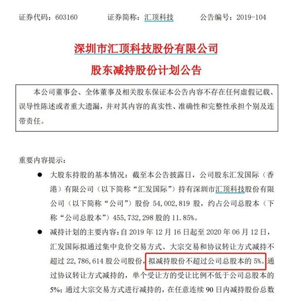 汇顶科技昨日晚间公告,持股11.85%的大股东汇发国际(香港)有限公司拟减持公司股份不超2278.66万股,拟减持股份不超公司总股本的5%。拟减持时间为2019年12月16日起至2020年06月12日。