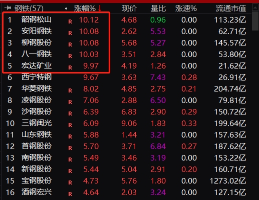 今日,韶钢松山、安阳钢铁、柳钢股份、八一钢铁、宏达矿业等钢铁股集体涨停,西宁特钢、华菱钢铁、凌钢股份涨逾7%。
