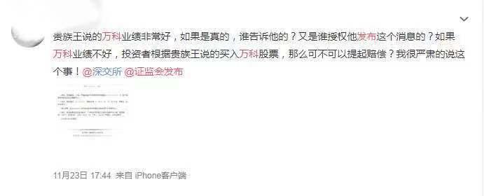 王石此言一出,立马引起了网友的热烈讨论,表示王石涉嫌违规公布未发布的信息。甚至,还有投资者在微博上提出质疑,“如果是真的,谁告诉他的?又是谁授权他发布这个消息的?”同时,还分别艾特了深交所和证监会的官方微博。