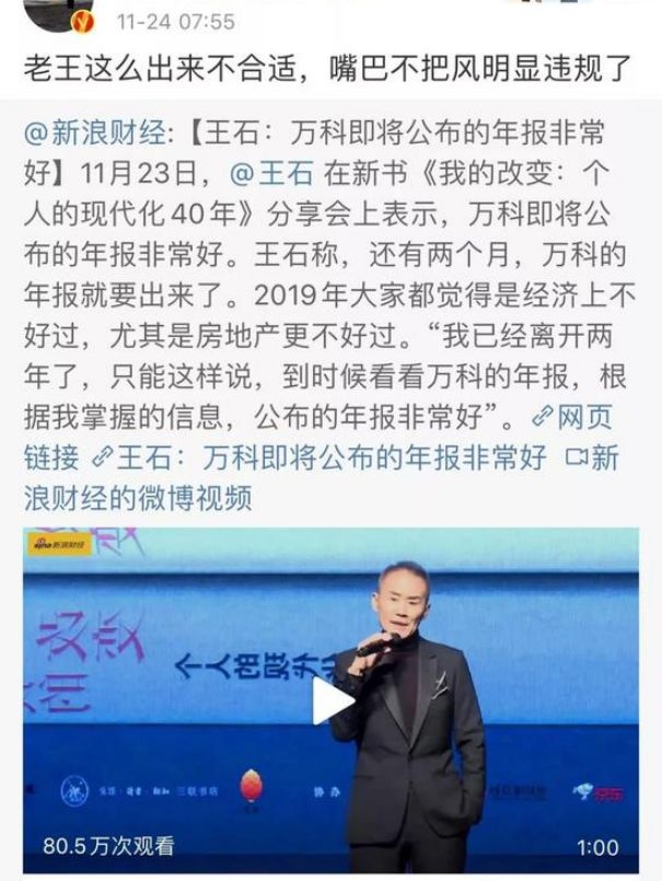 王石透露,“我已经离开两年了,我只能这样说,根据我掌握的信息,万科的年报非常好。”
