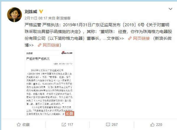 2月11日,刚履新格力电器独董的刘姝威为“闺蜜”董明珠“抱打不平”,发表千字文章《严格监管,严格执法》。她在文中说到:“如果广东证监局给董明珠发《警示函》,而对方洪波的行为不发警告,那么广东证监局是否选择性执法?”指的正是方洪波也提前泄露业绩一事。