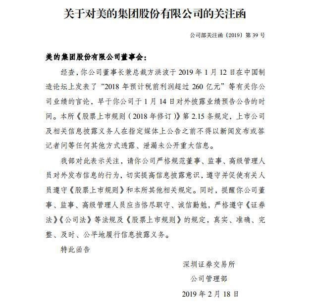 2月18日晚间,深交所下发对美的集团的关注函,公司董事长兼总裁方洪波于2019年1月12日在中国制造论坛上发表了“2018年预计税前利润超过260亿元”等公司业绩的言论,早于公司于1月14日对外披露业绩预告公告的时间。深交所对此表示关注,要求公司严格规范董监高对外发布信息的行为,切实提高信息披露意识。